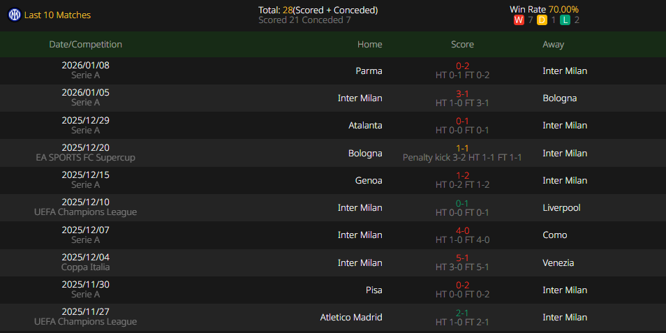 In their last match against Parma, Inter Milan rotated several key players, allowing the likes of Nicolò Barella, Marcus Thuram and Francesco Acerbi to get a much-needed rest. Inter tops Serie A this season with a record of 14 wins and 4 losses. However, a major concern is their poor record against top-five teams—they have only managed to beat Roma, losing all other matches against fellow title contenders. This lack of success against strong opposition is the biggest problem facing manager Cristian Chivu, as highlighted by their surprising defeat to Bologna in the Italian Super Cup.