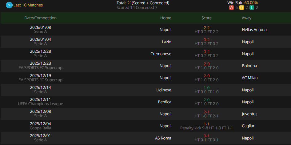 Napoli currently sits 3rd in the league with 12 wins, 2 draws and 2 losses. A win in this match would see them climb to the top of the table, making this one of the most crucial games of their season. Over the past month, Napoli has recorded 2 wins, 2 draws and 1 loss in Serie A, while also lifting the Italian Super Cup trophy. Their record against top teams this season is impressive, with their only defeat coming against AC Milan. There is no doubt about Antonio Conte’s ability to manage the team in the league.