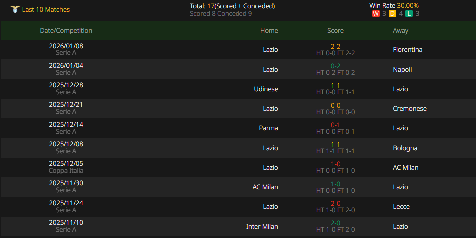 An impressive statistic for Lazio this season is that goals scored in the first half account for 50% of their total goals in 19 league matches. What’s more, whenever they take the lead in a league game this term, they have gone on to win 100% of the time. Their defensive record has been rock-solid, conceding only 12 goals in 15 official matches, while keeping eight clean sheets. Notably, the list of teams they have shut out includes Serie A heavyweights like Juventus and Atalanta, fully demonstrating the strength of their defensive line.
