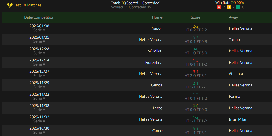 Verona’s recent form has been lacklustre on the whole, though a hard-fought away draw against Napoli in their last league game was a positive result. Operating on a low budget has made it increasingly difficult for Verona to compete in Serie A this season. They have only managed two wins so far, currently sitting at the bottom of the table with the same number of points as Pisa and Fiorentina. The few bright spots for Verona this term have come from their forward line; African striker Orban and Brazilian frontman Giovane both turned in solid performances in the first half of the season, and they will be the team’s best hope of finding the back of the net in this fixture.