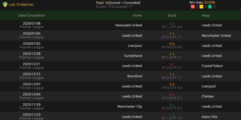 Leeds United put in a stunning performance in December that sent shockwaves through the Premier League, picking up points against the likes of Chelsea, Liverpool and Manchester United. Their top scorer Dominic Calvert-Lewin has been in sensational form, scoring 6 goals in 7 matches. Leeds have now pulled clear of the relegation zone, but their away win rate is a mere 9%. While this figure is very low, this match presents a great opportunity for them to break their away slump. Since switching to a three-defender system, Leeds’ defense has become much tighter, allowing them to play more aggressively in attack.