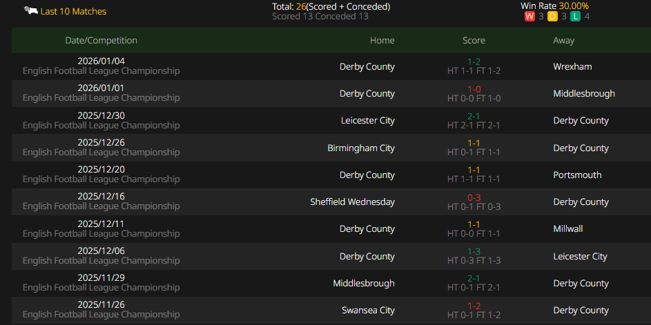 Derby County currently ranks 13th in the Championship with 9 wins, 8 draws and 9 losses, a rather mediocre record. The team’s defense is poor, having conceded 35 goals so far this season, with a win rate of only 34%. Their home win rate is even lower at 28%, worse than their away win rate, meaning that playing at home is not necessarily an advantage for Derby County in this match. The most likely strategy for Derby County in this game is to leverage their aerial advantage and sit deep to deny Leeds United any attacking space.