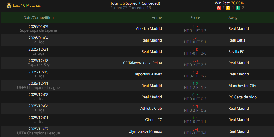 Real Madrid sits second in La Liga with 14 wins, 3 draws and 2 losses, four points adrift of league leaders Barcelona. While their total goals scored in the last 20 games are four fewer than Barcelona’s, their defensive record is far more solid, conceding seven goals less than the Blaugrana. However, there is a major defensive worry: Rüdiger sustained an injury that looked serious when he walked off the pitch in the last match. On the bright side, Marco Asensio is confirmed to be fit for the game. If Jesús Vallejo can make a timely return from injury, Real Madrid’s defensive line will remain relatively stable.