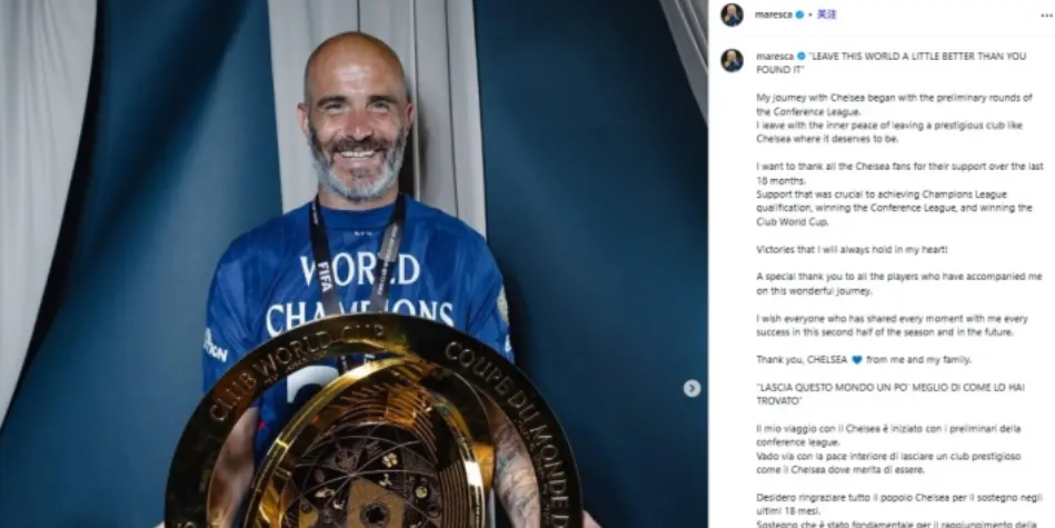 Maresca took over as Chelsea head coach in the summer of 2024 and has led the team for just one and a half seasons. Last season, he guided Chelsea to a 4th-place finish in the Premier League, and claimed the Europa Conference League and FIFA Club World Cup titles.